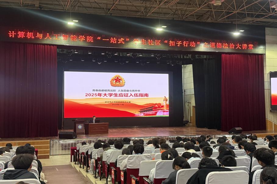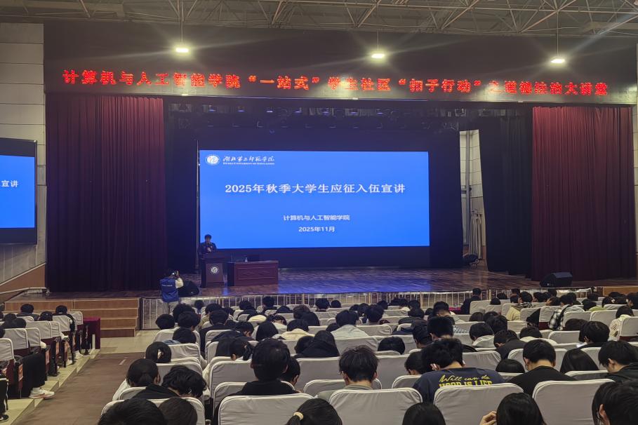 本网讯(通讯员 张煜)2025 年 11 月 13日,计算机与人工智能学院 2026年春季征兵宣讲会顺利举办。活动以红歌暖场点燃现场氛围,特邀25级电子商务(专升本)退役士兵陈心豪同学分享军旅经历,学院廖航老师解读征兵政策,以及2025级全体新生共同参加了本次活动。