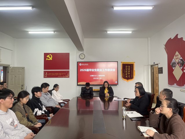 本网讯(通讯员 李婷)2025年11月12日上午10时30分,计算机与人工智能学院在10号教学楼三楼会议室召开毕业生就业工作座谈会。学院党委书记陈宇、院长杨莉、党委副书记王敏、副院长王海军、实训教师曹晓明、毕业班辅导员及毕业生代表等共同参会。