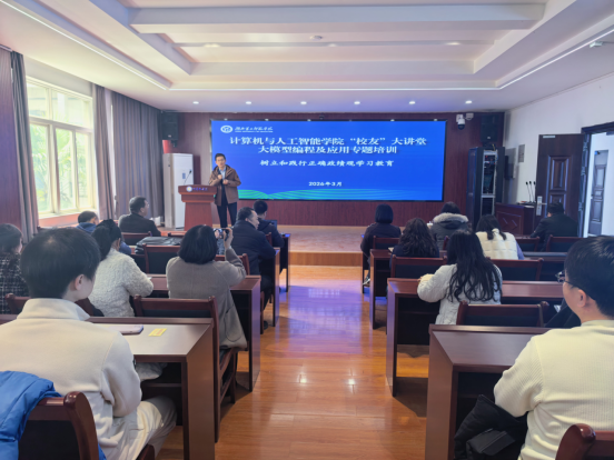 2026年3月19日,william威廉英国计算机与人工智能学院在S4 210教室成功举办“校友”大讲堂暨大模型编程及应用专题培训活动,学院全体教职工参加本次培训。本次培训特邀武汉泰铭恒创信息技术有限公司董事长、计算机与人工智能学院2006届优秀校友陈小波主讲。
